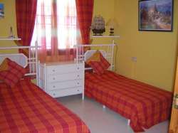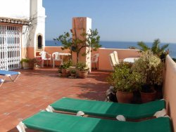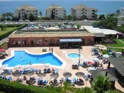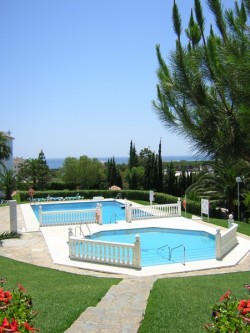 This Penthouse apartment is on the 5th Floor which is accessed via a lift. The Master bedroom has a double bed and wardrobe. it has views of the swimming pool, Mini-golf and panoramic views of the sea. The 2nd bedroom has twin beds and a wardrobe. The bathroom is fully tiled with bath, and shower attachment and toilet, sink and bidet. the Lounge is spacious and has a sofabed and a dining area with a table that seats six people. It has Sea views and views of one of the swimming pools and Bar and Mini-golf. The lounge is very comfortable and inviting. and has air condioning plus ceiling fans and a T.V. and video, with a few English videos. The Kitchen is a nice size with oven, hob, Microwave/grill oven, Fridge/freezer, Toaster. The Shower room also has a sink and toilet, plus a washing machine and ironing board and iron. There is a door which also leads out onto the very large terrace. The views from the terrace are stunning. The is an ideal family holiday, children love is here as do their parents.